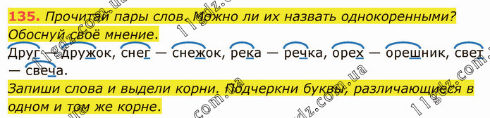 Прочитай пары слов. Можно ли их назвать однокоренными? Обоснуй своё мнение. Друг — дружок, снег — снежок, река — речка, орех — орешник, свет — свеча. Запиши слова и выдели корни. Подчеркни буквы, различающиеся в одном и том же корне.