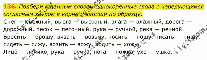 Подбери к данным словам однокоренные слова с чередующимся согласным звуком в корне и запиши по образцу. Снег — снежный, вьюга — вьюжный, влага — влажный, дорога — дорожный, песок — песочный, рука — ручной, река — речной. Бросить — брошу, вязать — возьму, носить — ношу, писать — пишу, сидеть — сижу, возить — вожу, ходить — хожу. Лицо — личико, рука — ручка, нога — ножка, ухо — ушко.