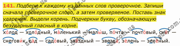 Подбери к каждому из данных слов проверочное. Запиши сначала проверочное слово, а затем проверяемое. Поставь знак ударения. Выдели корень. Подчеркни букву, обозначающую безударный гласный в корне. хо́лод — холо́дный, ма́ленький — малы́ш, по́чта — почто́вый, сне́г —снегови́к, са́д — садо́вый, звё́здный — звезда́, зе́лень — зелёный.