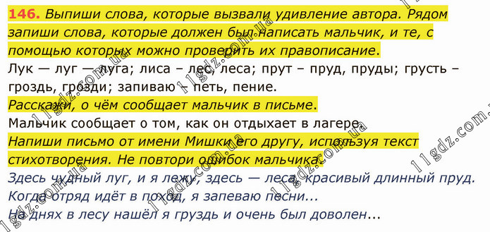 Выпиши слова, которые вызвали удивление автора. Рядом запиши слова, которые должен был написать мальчик, и те, с помощью которых можно проверить их правописание. Лук — луг — луга; лиса – лес, леса; прут – пруд, пруды; грусть – гроздь, грозди; запиваю – петь, пение. Расскажи, о чём сообщает мальчик в письме. Мальчик сообщает о том, как он отдыхает в лагере. Напиши письмо от имени Мишки его другу, используя текст стихотворения. Не повтори ошибок мальчика. Здесь чудный луг, и я лежу, здесь — леса, красивый длинный пруд. Когда отряд идёт в поход, я запеваю песни... На днях в лесу нашёл я груздь и очень был доволен...