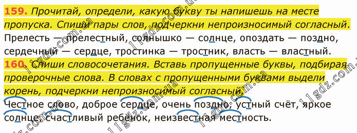 Прочитай, определи, какую букву ты напишешь на месте пропуска. Спиши пары слов, подчеркни непроизносимый согласный. Прелесть — прелестный, солнышко — солнце, опоздать — поздно, сердечный — сердце, тростинка — тростник, власть — властный. 160. Спиши словосочетания. Вставь пропущенные буквы, подбирая проверочные слова. В словах с пропущенными буквами выдели корень, подчеркни непроизносимый согласный. Честное слово, доброе сердце, очень поздно, устный счёт, яркое солнце, счастливый ребёнок, неизвестная местность.