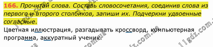 Прочитай слова. Составь словосочетания, соединив слова из первого и второго столбиков, запиши их. Подчеркни удвоенные согласные. Цветная иллюстрация, разгадывать кроссворд, компьютерная программа, аккуратный ученик.