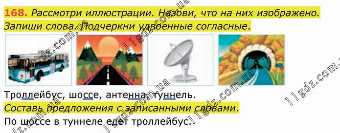 Рассмотри иллюстрации. Назови, что на них изображено. Запиши слова. Подчеркни удвоенные согласные. Троллейбус, шоссе, антенна, туннель. Составь предложения с записанными словами. По шоссе в туннеле едет троллейбус.