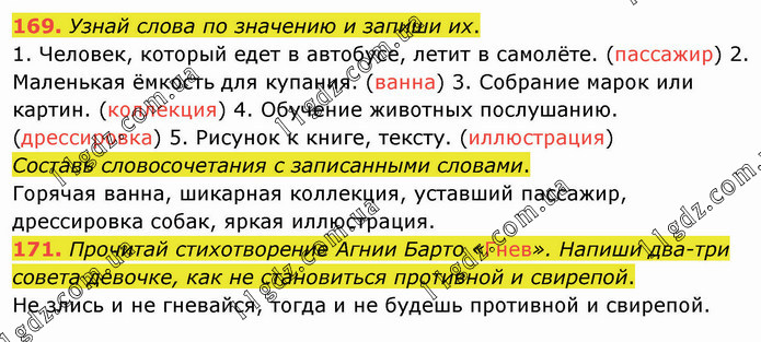 Узнай слова по значению и запиши их. 1. Человек, который едет в автобусе, летит в самолёте. (пассажир) 2. Маленькая ёмкость для купания. (ванна) 3. Собрание марок или картин. (коллекция) 4. Обучение животных послушанию. (дрессировка) 5. Рисунок к книге, тексту. (иллюстрация) Составь словосочетания с записанными словами. Горячая ванна, шикарная коллекция, уставший пассажир, дрессировка собак, яркая иллюстрация. 171. Прочитай стихотворение Агнии Барто «Гнев». Напиши два-три совета девочке, как не становиться противной и свирепой. Не злись и не гневайся, тогда и не будешь противной и свирепой.