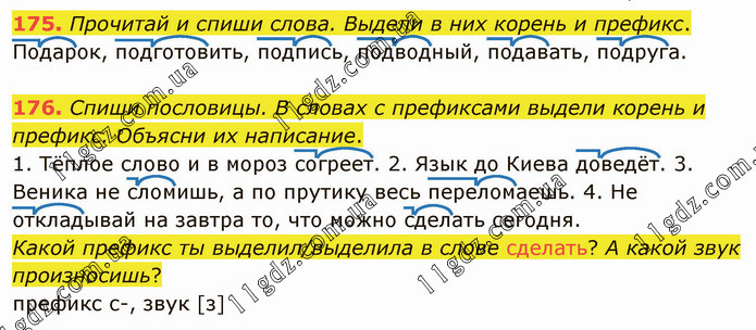 Прочитай и спиши слова. Выдели в них корень и префикс. Подарок, подготовить, подпись, подводный, подавать, подруга. 176. Спиши пословицы. В словах с префиксами выдели корень и префикс. Объясни их написание. 1. Тёплое слово и в мороз согреет. 2. Язык до Киева доведёт. 3. Веника не сломишь, а по прутику весь переломаешь. 4. Не откладывай на завтра то, что можно сделать сегодня. Какой префикс ты выделил/выделила в слове сделать? А какой звук произносишь? префикс с-, звук [з]