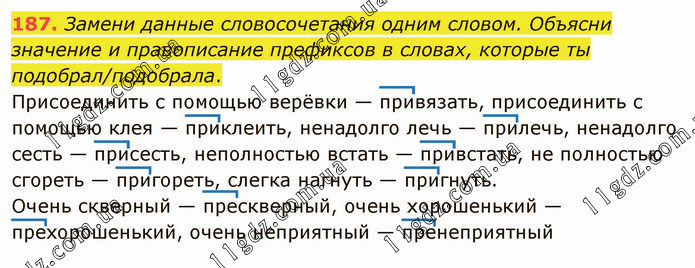 Замени данные словосочетания одним словом. Объясни значение и правописание префиксов в словах, которые ты подобрал/подобрала. Присоединить с помощью верёвки — привязать, присоединить с помощью клея — приклеить, ненадолго лечь — прилечь, ненадолго сесть — присесть, неполностью встать — привстать, не полностью сгореть — пригореть, слегка нагнуть — пригнуть. Очень скверный — прескверный, очень хорошенький — прехорошенький, очень неприятный — пренеприятный
