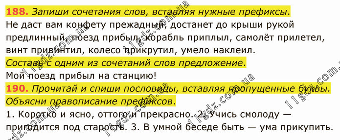 Запиши сочетания слов, вставляя нужные префиксы. Не даст вам конфету прежадный, достанет до крыши рукой предлинный, поезд прибыл, корабль приплыл, самолёт прилетел, винт привинтил, колесо прикрутил, умело наклеил. Составь с одним из сочетаний слов предложение. Мой поезд прибыл на станцию! 190. Прочитай и спиши пословицы, вставляя пропущенные буквы. Объясни правописание префиксов. 1. Коротко и ясно, оттого и прекрасно. 2. Учись смолоду — пригодится под старость. 3. В умной беседе быть — ума прикупить.