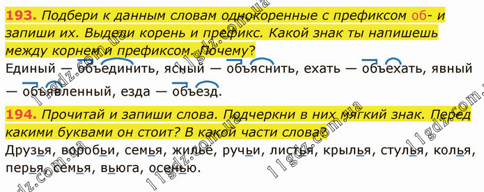 Подбери к данным словам однокоренные с префиксом об- и запиши их. Выдели корень и префикс. Какой знак ты напишешь между корнем и префиксом. Почему? Единый — объединить, ясный — объяснить, ехать — объехать, явный — объявленный, езда — объезд. 194. Прочитай и запиши слова. Подчеркни в них мягкий знак. Перед какими буквами он стоит? В какой части слова? Друзья, воробьи, семья, жильё, ручьи, листья, крылья, стулья, колья, перья, семья, вьюга, осенью.