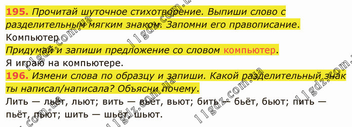 Прочитай шуточное стихотворение. Выпиши слово с разделительным мягким знаком. Запомни его правописание. Компьютер Придумай и запиши предложение со словом компьютер. Я играю на компьютере. 196. Измени слова по образцу и запиши. Какой разделительный знак ты написал/написала? Объясни почему. Лить — льёт, льют; вить — вьёт, вьют; бить — бьёт, бьют; пить — пьёт, пьют; шить — шьёт, шьют.