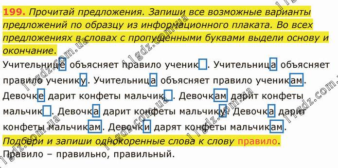 Прочитай предложения. Запиши все возможные варианты предложений по образцу из информационного плаката. Во всех предложениях в словах с пропущенными буквами выдели основу и окончание. Учительнице объясняет правило ученик . Учительница объясняет правило ученику. Учительница объясняет правило ученикам. Девочке дарит конфеты мальчик . Девочкам дарит конфеты мальчик . Девочка дарит конфеты мальчику. Девочка дарит конфеты мальчикам. Девочки дарят конфеты мальчикам. Подбери и запиши однокоренные слова к слову правило. Правило – правильно, правильный.
