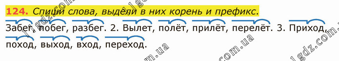 Спиши слова, выдели в них корень и префикс. Забег, побег, разбег. 2. Вылет, полёт, прилёт, перелёт. 3. Приход, поход, выход, вход, переход.