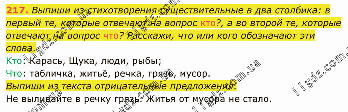 Выпиши из стихотворения существительные в два столбика: в первый те, которые отвечают на вопрос кто?, а во второй те, которые отвечают на вопрос что? Расскажи, что или кого обозначают эти слова. Кто: Карась, Щука, люди, рыбы; Что: табличка, житьё, речка, грязь, мусор. Выпиши из текста отрицательные предложения. Не выливайте в речку грязь. Житья от мусора не стало.