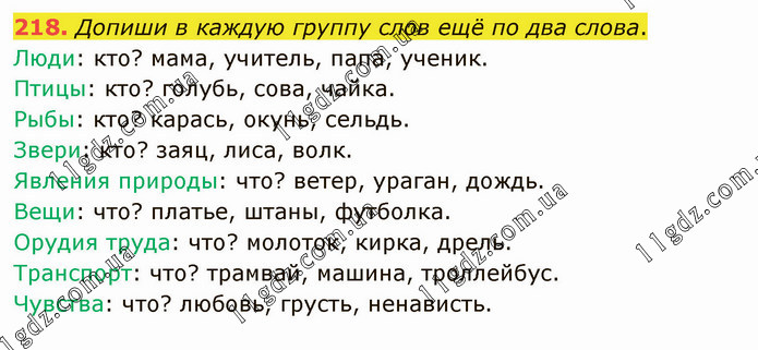 Допиши в каждую группу слов ещё по два слова. Люди: кто? мама, учитель, папа, ученик. Птицы: кто? голубь, сова, чайка. Рыбы: кто? карась, окунь, сельдь. Звери: кто? заяц, лиса, волк. Явления природы: что? ветер, ураган, дождь. Вещи: что? платье, штаны, футболка. Орудия труда: что? молоток, кирка, дрель. Транспорт: что? трамвай, машина, троллейбус. Чувства: что? любовь, грусть, ненависть.