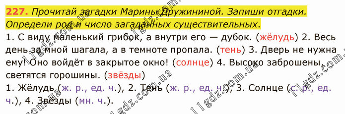 Прочитай загадки Марины Дружининой. Запиши отгадки. Определи род и число загаданных существительных. 1. С виду маленький грибок, а внутри его — дубок. (жёлудь) 2. Весь день за мной шагала, а в темноте пропала. (тень) 3. Дверь не нужна ему! Оно войдёт в закрытое окно! (солнце) 4. Высоко заброшены, светятся горошины. (звёзды) 1. Жёлудь (ж. р., ед. ч.), 2. Тень (ж. р., ед. ч.), 3. Солнце (с. р., ед. ч.), 4. Звёзды (мн. ч.).
