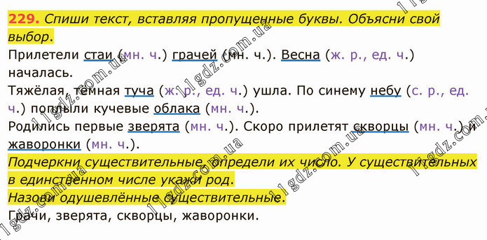Спиши текст, вставляя пропущенные буквы. Объясни свой выбор. Прилетели стаи (мн. ч.) грачей (мн. ч.). Весна (ж. р., ед. ч.) началась. Тяжёлая, тёмная туча (ж. р., ед. ч.) ушла. По синему небу (с. р., ед. ч.) поплыли кучевые облака (мн. ч.). Родились первые зверята (мн. ч.). Скоро прилетят скворцы (мн. ч.) и жаворонки (мн. ч.). Подчеркни существительные, определи их число. У существительных в единственном числе укажи род. Назови одушевлённые существительные. Грачи, зверята, скворцы, жаворонки.