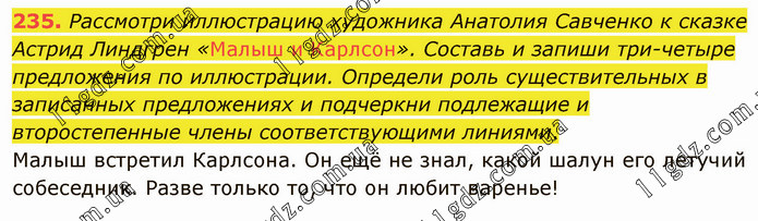 Рассмотри иллюстрацию художника Анатолия Савченко к сказке Астрид Линдгрен «Малыш и Карлсон». Составь и запиши три-четыре предложения по иллюстрации. Определи роль существительных в записанных предложениях и подчеркни подлежащие и второстепенные члены соответствующими линиями. Малыш встретил Карлсона. Он ещё не знал, какой шалун его летучий собеседник. Разве только то, что он любит варенье!