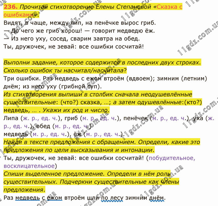 Прочитай стихотворение Елены Степановой «Сказка с ошибками». Видят, в чаще, между лип, на пенёчке вырос гриб. — До чего же гриб хорош! — говорит медведю ёж. — Из него уху, сосед, сварим завтра на обед. Ты, дружочек, не зевай: все ошибки сосчитай! Выполни задание, которое содержится в последних двух строках. Сколько ошибок ты насчитал/насчитала? Три ошибки. Раз медведь с ежом втроём (вдвоем); зимним (летним) днём; из него уху (грибной суп). Из стихотворения выпиши в столбик сначала неодушевлённые существительные: (что?) сказка, …; а затем одушевлённые:(кто?) медведь, … . Укажи их род и число. Липа (ж. р., ед. ч.), гриб (м. р., ед. ч.), пенёчек (м. р., ед. ч.), уха (ж. р., ед. ч.), обед (м. р., ед. ч.) медведь (м. р., ед. ч.), ёж (м. р., ед. ч.). Найди в тексте предложения с обращением. Определи, какие это предложения по цели высказывания и интонации. Ты, дружочек, не зевай: все ошибки сосчитай! (побудительное, восклицательное) Спиши выделенное предложение. Определи в нём роль существительных. Подчеркни существительные как члены предложения. Раз медведь с ежом втроём шли по лесу зимним днём.