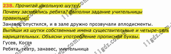 Прочитай школьную шутку. Почему засмеялись ребята? Выполни задание учительницы правильно. Занавес опустился, и в зале дружно прозвучали аплодисменты. Выпиши из шутки собственные имена существительные и четыре-пять нарицательных. Объясни употребление прописной буквы. Гусев, Костя Ребята, театр, занавес, учительница
