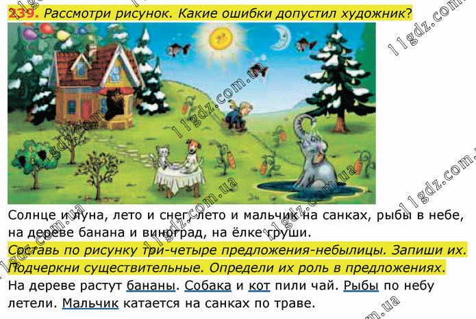 Рассмотри рисунок. Какие ошибки допустил художник? Солнце и луна, лето и снег, лето и мальчик на санках, рыбы в небе, на дереве банана и виноград, на ёлке груши. Составь по рисунку три-четыре предложения-небылицы. Запиши их. Подчеркни существительные. Определи их роль в предложениях. На дереве растут бананы. Собака и кот пили чай. Рыбы по небу летели. Мальчик катается на санках по траве.