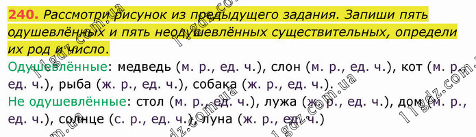 Рассмотри рисунок из предыдущего задания. Запиши пять одушевлённых и пять неодушевлённых существительных, определи их род и число. Одушевлённые: медведь (м. р., ед. ч.), слон (м. р., ед. ч.), кот (м. р., ед. ч.), рыба (ж. р., ед. ч.), собака (ж. р., ед. ч.). Не одушевлённые: стол (м. р., ед. ч.), лужа (ж. р., ед. ч.), дом (м. р., ед. ч.), солнце (с. р., ед. ч.), луна (ж. р., ед. ч.)