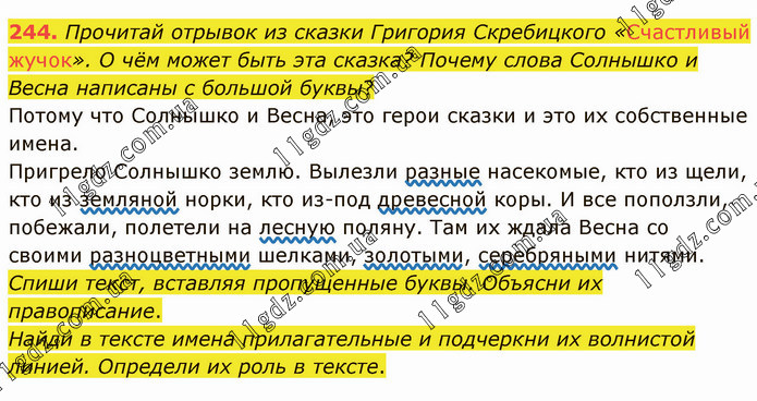 Прочитай отрывок из сказки Григория Скребицкого «Счастливый жучок». О чём может быть эта сказка? Почему слова Солнышко и Весна написаны с большой буквы? Потому что Солнышко и Весна, это герои сказки и это их собственные имена. Пригрело Солнышко землю. Вылезли разные насекомые, кто из щели, кто из земляной норки, кто из-под древесной коры. И все поползли, побежали, полетели на лесную поляну. Там их ждала Весна со своими разноцветными шелками, золотыми, серебряными нитями. Спиши текст, вставляя пропущенные буквы. Объясни их правописание. Найди в тексте имена прилагательные и подчеркни их волнистой линией. Определи их роль в тексте.