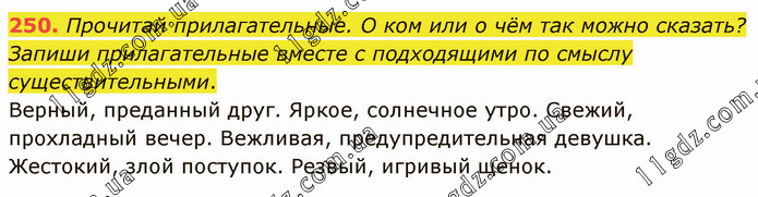 Прочитай прилагательные. О ком или о чём так можно сказать? Запиши прилагательные вместе с подходящими по смыслу существительными. Верный, преданный друг. Яркое, солнечное утро. Свежий, прохладный вечер. Вежливая, предупредительная девушка. Жестокий, злой поступок. Резвый, игривый щенок.