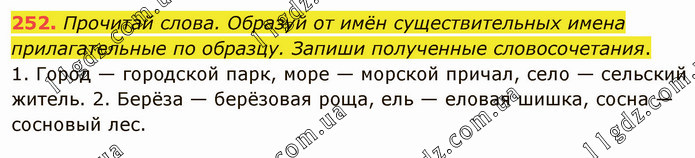 Прочитай слова. Образуй от имён существительных имена прилагательные по образцу. Запиши полученные словосочетания. 1. Город — городской парк, море — морской причал, село — сельский житель. 2. Берёза — берёзовая роща, ель — еловая шишка, сосна — сосновый лес.