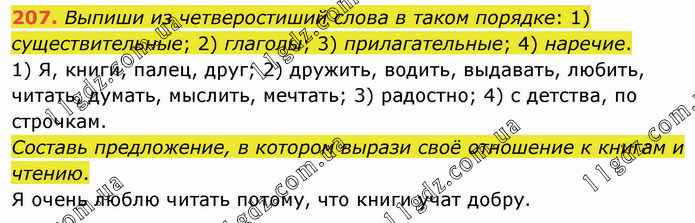 Выпиши из четверостиший слова в таком порядке: 1) существительные; 2) глаголы; 3) прилагательные; 4) наречие. 1) Я, книги, палец, друг; 2) дружить, водить, выдавать, любить, читать, думать, мыслить, мечтать; 3) радостно; 4) с детства, по строчкам. Составь предложение, в котором вырази своё отношение к книгам и чтению. Я очень люблю читать потому, что книги учат добру.