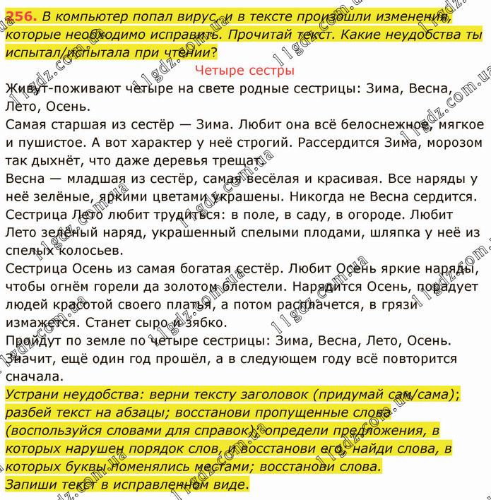 В компьютер попал вирус, и в тексте произошли изменения, которые необходимо исправить. Прочитай текст. Какие неудобства ты испытал/испытала при чтении? Четыре сестры Живут-поживают четыре на свете родные сестрицы: Зима, Весна, Лето, Осень. Самая старшая из сестёр — Зима. Любит она всё белоснежное, мягкое и пушистое. А вот характер у неё строгий. Рассердится Зима, морозом так дыхнёт, что даже деревья трещат. Весна — младшая из сестёр, самая весёлая и красивая. Все наряды у неё зелёные, яркими цветами украшены. Никогда не Весна сердится. Сестрица Лето любит трудиться: в поле, в саду, в огороде. Любит Лето зелёный наряд, украшенный спелыми плодами, шляпка у неё из спелых колосьев. Сестрица Осень из самая богатая сестёр. Любит Осень яркие наряды, чтобы огнём горели да золотом блестели. Нарядится Осень, порадует людей красотой своего платья, а потом расплачется, в грязи измажется. Станет сыро и зябко. Пройдут по земле по четыре сестрицы: Зима, Весна, Лето, Осень. Значит, ещё один год прошёл, а в следующем году всё повторится сначала. Устрани неудобства: верни тексту заголовок (придумай сам/сама); разбей текст на абзацы; восстанови пропущенные слова (воспользуйся словами для справок); определи предложения, в которых нарушен порядок слов, и восстанови его; найди слова, в которых буквы поменялись местами; восстанови слова. Запиши текст в исправленном виде.