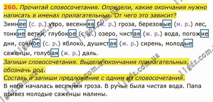 Прочитай словосочетания. Определи, какие окончания нужно написать в именах прилагательных. От чего это зависит? Зимнее (с. р.) утро, весенняя (ж. р.) гроза, березовые (м. р.) лес, тонкие ветки, глубокое (с. р.) озеро, чистая (ж. р.) вода, погожие дни, сочное (с. р.) яблоко, душистая (ж. р.) сирень, молодые саженцы, голубая (ж. р.) даль. Запиши словосочетания. Выдели окончания прилагательных, обозначь род. Составь и запиши предложение с одним из словосочетаний. В небе началась весенняя гроза. В ручье была чистая вода. Папа привез молодые саженцы малины.