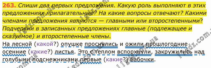 Спиши два первых предложения. Какую роль выполняют в этих предложениях прилагательные? На какие вопросы отвечают? Какими членами предложения являются — главными или второстепенными? Подчеркни в записанных предложениях главные (подлежащее и сказуемое) и второстепенные члены. На лесной (какой?) опушке проснулись и ожили прошлогодние осенние (какие?) листья. Это с теплом вспорхнули, закружились над голубыми подснежниками первые (какие?) бабочки.