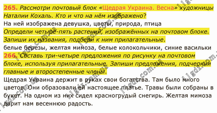 Рассмотри почтовый блок «Щедрая Украина. Весна» художницы Наталии Кохаль. Кто и что на нём изображено? На ней изображена девушка, цветы, природа, птица Определи четыре-пять растений, изображённых на почтовом блоке. Запиши их названия, подбери к ним прилагательные. белые березы, желтая мимоза, белые колокольчики, синие васильки 266. Составь три-четыре предложения по рисунку на почтовом блоке, используя прилагательные. Запиши предложения, подчеркни главные и второстепенные члены. Щедрая Украина держит в руках свои богатства. Там было много цветов. Они образовали ей настоящее платье. Травы были собраны в букет. На одном из них сидел красногрудый снегирь. Желтая мимоза дарит нам весеннюю радость.