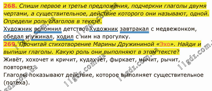 Спиши первое и третье предложения, подчеркни глаголы двумя чертами, а существительное, действие которого они называют, одной. Определи роль глаголов в тексте. Художник вспомнил детство. Художник завтракал с медвежонком, обедал и ужинал, ходил с ним на прогулку. 269. Прочитай стихотворение Марины Дружининой «Эхо». Найди и выпиши глаголы. Какую роль они выполняют в этом тексте? Живёт, хохочет и кричит, кудахчет, фыркает, мычит, рычит, повторяет. Глаголы показывают действие, которое выполняет существительное (потеха).