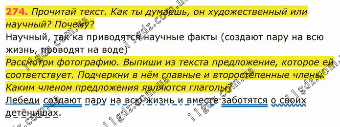 Прочитай текст. Как ты думаешь, он художественный или научный? Почему? Научный, так ка приводятся научные факты (создают пару на всю жизнь, проводят на воде) Рассмотри фотографию. Выпиши из текста предложение, которое ей соответствует. Подчеркни в нём главные и второстепенные члены. Каким членом предложения являются глаголы? Лебеди создают пару на всю жизнь и вместе заботятся о своих детёнышах.