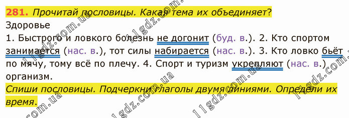 Прочитай пословицы. Какая тема их объединяет? Здоровье 1. Быстрого и ловкого болезнь не догонит (буд. в.). 2. Кто спортом занимается (нас. в.), тот силы набирается (нас. в.). 3. Кто ловко бьёт по мячу, тому всё по плечу. 4. Спорт и туризм укрепляют (нас. в.) организм. Спиши пословицы. Подчеркни глаголы двумя линиями. Определи их время.
