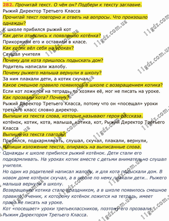 Прочитай текст. О чём он? Подбери к тексту заглавие. Рыжий Директор Третьего Класса Прочитай текст повторно и ответь на вопросы. Что произошло однажды? К школе прибился рыжий кот Как дети отнеслись к появлению котёнка? Прикормили его и оставили в класе. Как котик вёл себя на уроках? Слушал учителя Почему для кота пришлось подыскать дом? Родитель написали жалобу. Почему рыжего малыша вернули в школу? За ним плакали дети, а котик скучал. Какое смешное правило появилось в школе с возвращением котика? Если кот ложился на тетрадь, то хозяин её, мог не писать на уроке. Как прозвали кота? Почему? Рыжий Директор Третьего Класса, потому что он «посещал» уроки третьего класс словно директор. Выпиши из текста слова, которые называют героя рассказа. котёнок, котик, кота, малыша, котика, кот, Рыжий Директор Третьего Класса Выпиши из текста глаголы. Прибился, подкармливать, слушал, скучал, плакали, вернули, Напиши изложение текста, опираясь на выписанные слова. Однажды к школе прибился рыжий котёнок. Дети стали его подкармливать. На уроках котик вместе с детьми внимательно слушал учителя. Но один из родителей написал жалобу, и для кота подыскали дом. В новом доме котёнок скучал, а в школе по нему плакали дети… Рыжего малыша вернули в школу. Возвращение котика стало праздником, а в школе появилось смешное правило. Ученик, к которому котёнок ложится на тетрадь, имеет право не писать на уроке. Кот «посещает» уроки третьеклассников, поэтому его прозвали Рыжим Директором Третьего Класса.