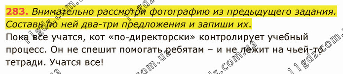 Внимательно рассмотри фотографию из предыдущего задания. Составь по ней два-три предложения и запиши их. Пока все учатся, кот «по-директорски» контролирует учебный процесс. Он не спешит помогать ребятам – и не лежит на чьей-то тетради. Учатся все!