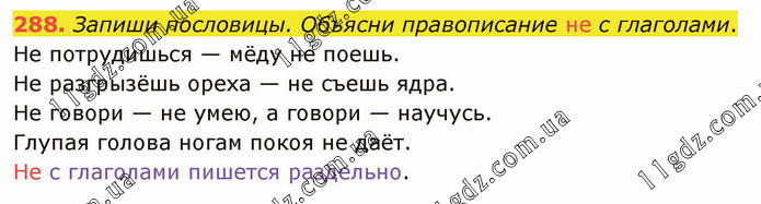 Запиши пословицы. Объясни правописание не с глаголами. Не потрудишься — мёду не поешь. Не разгрызёшь ореха — не съешь ядра. Не говори — не умею, а говори — научусь. Глупая голова ногам покоя не даёт. Не с глаголами пишется раздельно.