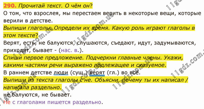 Прочитай текст. О чём он? О том, что взрослея, мы перестаем верить в некоторые вещи, которые верили в детстве. Выпиши глаголы. Определи их время. Какую роль играют глаголы в этом тексте? Верят, есть, не балуются, слушаются, съедают, идут, задумываются, приходят, бывает - (нас. в.). Спиши первое предложение. Подчеркни главные члены. Укажи, какими частями речи выражено подлежащее и сказуемое. В раннем детстве люди (сущ.) верят (гл.) во всё. Выпиши из текста глаголы с не. Объясни, почему ты их написал / написала раздельно. не балуются, не бывает. Не с глаголами пишется раздельно.