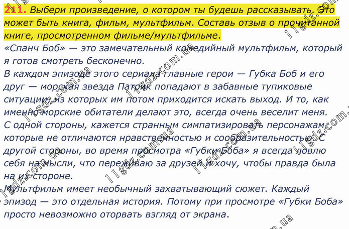 Выбери произведение, о котором ты будешь рассказывать. Это может быть книга, фильм, мультфильм. Составь отзыв о прочитанной книге, просмотренном фильме/мультфильме. «Спанч Боб» — это замечательный комедийный мультфильм, который я готов смотреть бесконечно. В каждом эпизоде этого сериала главные герои — Губка Боб и его друг — морская звезда Патрик попадают в забавные тупиковые ситуации, из которых им потом приходится искать выход. И то, как именно морские обитатели делают это, всегда очень веселит меня. С одной стороны, кажется странным симпатизировать персонажам, которые не отличаются нравственностью и сообразительностью. С другой стороны, во время просмотра «Губки Боба» я всегда ловлю себя на мысли, что переживаю за друзей и хочу, чтобы правда была на их стороне. Мультфильм имеет необычный захватывающий сюжет. Каждый эпизод — это отдельная история. Потому при просмотре «Губки Боба» просто невозможно оторвать взгляд от экрана.