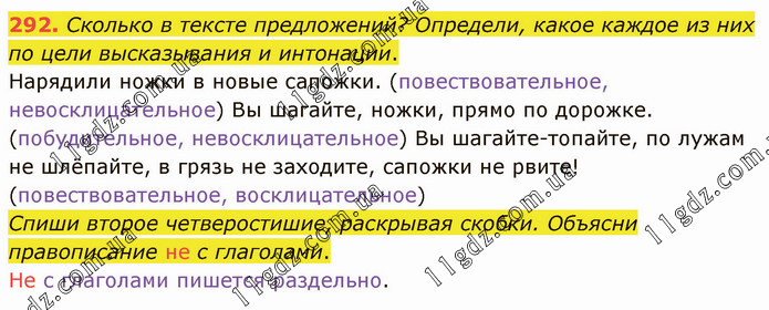 Сколько в тексте предложений? Определи, какое каждое из них по цели высказывания и интонации. Нарядили ножки в новые сапожки. (повествовательное, невосклицательное) Вы шагайте, ножки, прямо по дорожке. (побудительное, невосклицательное) Вы шагайте-топайте, по лужам не шлёпайте, в грязь не заходите, сапожки не рвите! (повествовательное, восклицательное) Спиши второе четверостишие, раскрывая скобки. Объясни правописание не с глаголами. Не с глаголами пишется раздельно.