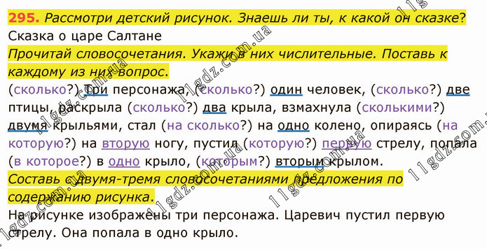 Рассмотри детский рисунок. Знаешь ли ты, к какой он сказке? Сказка о царе Салтане Прочитай словосочетания. Укажи в них числительные. Поставь к каждому из них вопрос. (сколько?) Три персонажа, (сколько?) один человек, (сколько?) две птицы, раскрыла (сколько?) два крыла, взмахнула (сколькими?) двумя крыльями, стал (на сколько?) на одно колено, опираясь (на которую?) на вторую ногу, пустил (которую?) первую стрелу, попала (в которое?) в одно крыло, (которым?) вторым крылом. Составь с двумя-тремя словосочетаниями предложения по содержанию рисунка. На рисунке изображены три персонажа. Царевич пустил первую стрелу. Она попала в одно крыло.