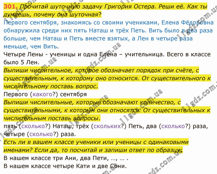 Прочитай шуточную задачу Григория Остера. Реши её. Как ты думаешь, почему она шуточная? Первого сентября, знакомясь со своими учениками, Елена Фёдоровна обнаружила среди них пять Наташ и трёх Петь. Вить было в два раза больше, чем Наташ и Петь вместе взятых, а Лен в четыре раза меньше, чем Вить. Четыре Лены - ученицы и одна Елена – учительница. Всего в классе было 5 Лен. Выпиши числительное, которое обозначает порядок при счёте, с существительным, к которому оно относится. От существительного к числительному поставь вопрос. Первого (какого?) сентября Выпиши числительные, которые обозначают количество, с существительными, к которым они относятся. От существительных к числительным поставь вопросы. пять (сколько?) Наташ, трёх (скольких?) Петь, два (сколько?) раза, четыре (сколько?) раза. Есть ли в вашем классе ученики или ученицы с одинаковыми именами? Если да, то посчитай и запиши ответ по образцу: В нашем классе три Ани, два Пети, …, … . В нашем классе четыре Кати и две Сони.