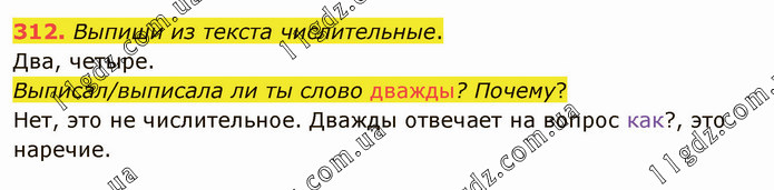 Выпиши из текста числительные. Два, четыре. Выписал/выписала ли ты слово дважды? Почему? Нет, это не числительное. Дважды отвечает на вопрос как?, это наречие.