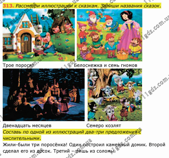Рассмотри иллюстрации к сказкам. Запиши названия сказок. Трое поросят Белоснежка и семь гномов Двенадцать месяцев Семеро козлят Составь по одной из иллюстраций два-три предложения с числительными. Жили-были три поросёнка! Один построил каменный домик. Второй сделал его из досок. Третий – лишь из соломы.