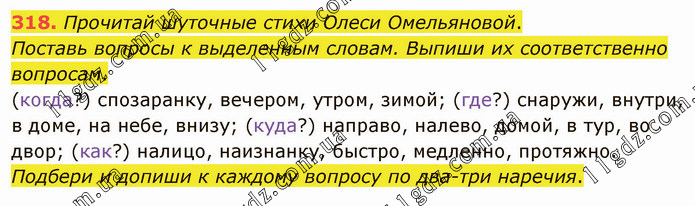 Прочитай шуточные стихи Олеси Омельяновой. Поставь вопросы к выделенным словам. Выпиши их соответственно вопросам. (когда?) спозаранку, вечером, утром, зимой; (где?) снаружи, внутри, в доме, на небе, внизу; (куда?) направо, налево, домой, в тур, во двор; (как?) налицо, наизнанку, быстро, медленно, протяжно. Подбери и допиши к каждому вопросу по два-три наречия.