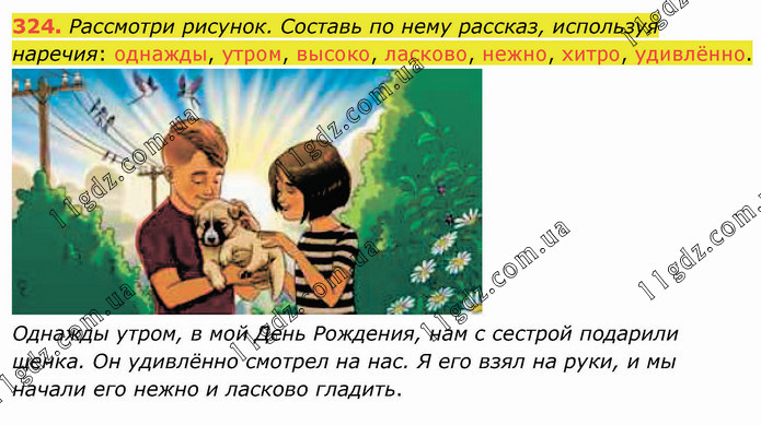 Рассмотри рисунок. Составь по нему рассказ, используя наречия: однажды, утром, высоко, ласково, нежно, хитро, удивлённо. Однажды утром, в мой День Рождения, нам с сестрой подарили щенка. Он удивлённо смотрел на нас. Я его взял на руки, и мы начали его нежно и ласково гладить.