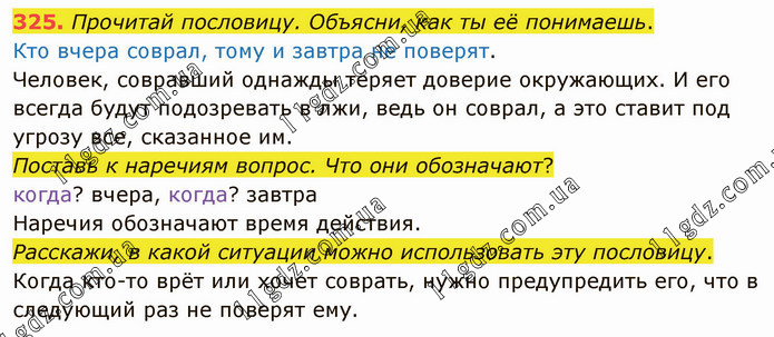 Прочитай пословицу. Объясни, как ты её понимаешь. Кто вчера соврал, тому и завтра не поверят. Человек, совравший однажды теряет доверие окружающих. И его всегда будут подозревать в лжи, ведь он соврал, а это ставит под угрозу все, сказанное им. Поставь к наречиям вопрос. Что они обозначают? когда? вчера, когда? завтра Наречия обозначают время действия. Расскажи, в какой ситуации можно использовать эту пословицу. Когда кто-то врёт или хочет соврать, нужно предупредить его, что в следующий раз не поверят ему.