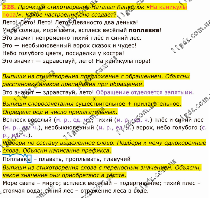 Прочитай стихотворение Натальи Капустюк «На каникулы пора!». Какое настроение оно создаёт? Выпиши из стихотворения предложение с обращением. Объясни расстановку знаков препинания при обращении. Это значит — здравствуй, лето! Обращение отделяется запятыми. Выпиши словосочетания сущест(Х)вительное + прилагательное. Определи род и число прилагательных. Всплеск веселый (м. р., ед. ч.), тихий (м. р., ед. ч.) плёс и синий лес (м. р., ед. ч.), необыкновенный (м. р., ед. ч.) ворох, небо голубого (с. р., ед. ч.). Разбери по составу выделенное слово. Подбери к нему однокоренные слова. Объясни написание префикса. Поплавка – плавать, проплывать, плавучий Выпиши из стихотворения слова с переносным значением. Объясни, какое значение они приобретают в тексте. Море света – много; всплеск весёлый – подергивание; тихий плёс – стоячая вода; синий лес – отражение леса в воде.