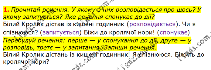 Прочитай речення. У якому з них розповідається про щось? У якому запитується? Яке речення спонукає до дії? Білий Кролик дістав із кишені годинник (розповідається). Чи я спізнююся? (запитується) Біжи до кролячої нори! (спонукає) Перебудуй речення: перше — у спонукання до дії, друге — у розповідь, третє — у запитання. Запиши речення. Білий Кролик дістань із кишені годинник! Я спізнююся. Біжить до кролячої нори?